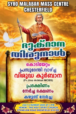 ചെസ്റ്റര്ഫീല്ഡ് സീറോ മലബാര് മിഷനില് ദുക്രാനാ തിരുനാള് ഈ വരുന്ന ഞായറാഴ്ച ജൂലൈ 6 ന് വൈകുന്നേരം 3 മണിക്ക് കൊടികയറ്റം, പ്രേസുദെന്തി വാഴ്ച്ച, തിരുനാള് കുര്ബാന, പ്രദഷിണം, സ്നേഹവിരുന്ന്, കഴുന്ന് നേര്ച്ച. പള്ളിയുടെ അഡ്രസ് The HOLISPIRIT CHURCH, STONELOW ROAD, DRONFIELD, S18 2EP.