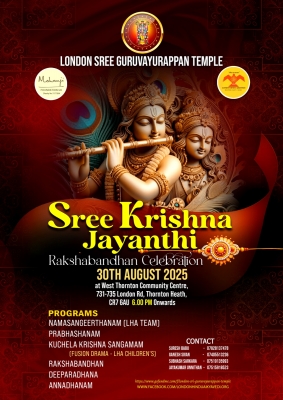ലണ്ടനില് ഒരു ഗുരുവായൂരപ്പ ക്ഷേത്രം എന്ന സാക്ഷാത്കാരത്തിമായി പ്രവര്ത്തിക്കുന്ന ലണ്ടന് ഹിന്ദു ഐക്യവേദിയും മോഹന്ജി ഫൗണ്ടേഷനും ചേര്ന്ന് ശ്രീകൃഷ്ണ ജയന്തി ആഘോഷങ്ങള് സംഘടിപ്പിക്കുന്നു. 2025 ഓഗസ്റ്റ് 30 ആം തീയതി ശനിയാഴ്ച വൈകുന്നേരം 6.00 മുതല് ലണ്ടനിലെ തൊണ്ടോന് ഹീത്തിലുള്ള