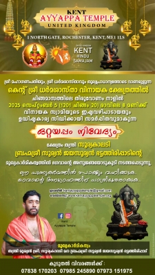 ഇംഗ്ലണ്ടിലെ കെന്റ് അയ്യപ്പ ക്ഷേത്രം.. ശ്രീ മഹാഗണപതിയും, ശ്രീ ധര്മശാസ്തവും തുല്യ പ്രാധന്യത്തോടെ വാണരുളുന്ന കെന്റ് ശ്രീ ധര്മശാസ്ത വിനായക ക്ഷേത്രത്തില് 2025 സെപ്റ്റംബര് 5 ആം തീയതി (1201 Chingam 20) ചിങ്ങമാസത്തിലെ തിരുവോണംനാളില് രാവിലെ 8 മണിക്ക് വിനായക സ്വാമിയുടെ ഇഷ്ടവഴിപാടായതും ഉദ്ധിഷ്ടകാര്യ