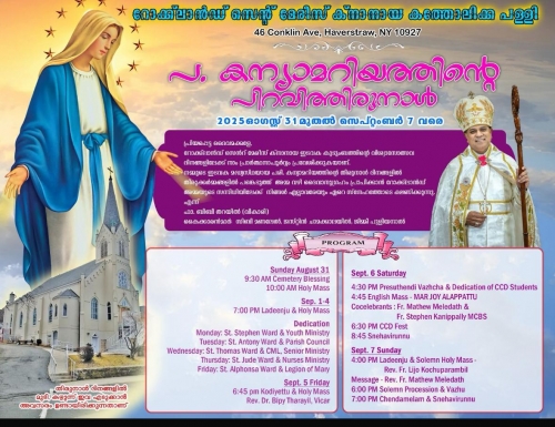 പരിശുദ്ധ കന്യക മാതാവിന്റെ തിരുന്നാള് ഓഗസ്റ്റ് 31 മുതല് സെപ്റ്റമ്പര് 7 വരെ റോക്ലാന്ഡ് സെന്റ് മേരീസ് ക്നാനായ കത്തൊലിക്ക ദേവാലയത്തില്