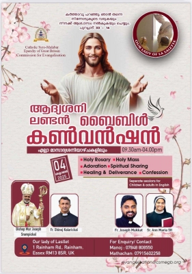 റയിന്ഹാം: ഗ്രേറ്റ് ബ്രിട്ടന് സീറോമലബാര് എപ്പാര്ക്കി ഇവാഞ്ചലൈസേഷന് കമ്മീഷന്റെ നേതൃത്വത്തില്, ലണ്ടനില് സംഘടിപ്പിക്കുന്ന 'ആദ്യ ശനിയാഴ്ച്ച ബൈബിള് കണ്വെന്ഷന്' ഒക്ടോബര് 4 ന് ശനിയാഴ്ച്ച. ആഗോള കത്തോലിക്കാസഭ പരിശുദ്ധ ജപമാല വണക്കത്തിനായി സമര്ക്കിപ്പെട്ട ഒക്ടോബര്