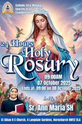 ലണ്ടന്: ആഗോള കത്തോലിക്കാ സഭ, ജപമാല മാസമായി ആചരിക്കുന്ന ഒക്ടോബറിന്റെ ഭാഗമായി, സീറോമലബാര് എപ്പാര്ക്കി ഇവാഞ്ചലൈസേഷന് കമ്മീഷന്റെ നേതൃത്വത്തില് അഖണ്ഡ ജപമാല സമര്പ്പണം ലണ്ടനിലെ ഹോണ്ചര്ച്ചില് വെച്ച് ഒരുക്കുന്നു. ഒക്ടോബര് 7-ാം തീയതി രാവിലെ 9 മണിക്ക് ആരംഭിക്കുന്ന ജപമാല, ഒക്ടോബര്